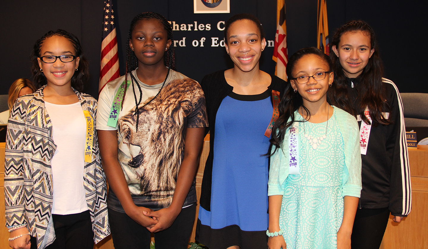 Charles County, MD – The Board of Education honored five students on Tuesday, March 8 for excellence in academic achievement, career readiness and personal responsibility. Honored were Olivia McNeil, fifth grader, William A. Diggs Elementary School; Erika Urrego, fifth grader, Dr. Samuel A. Mudd Elementary School; Kiara Thomas, fifth grader, J.P. Ryon Elementary School; Kierra Brevard, eighth grader, General Smallwood Middle School; and Jenesis Andrews-Kendale, sophomore, Thomas Stone High School.