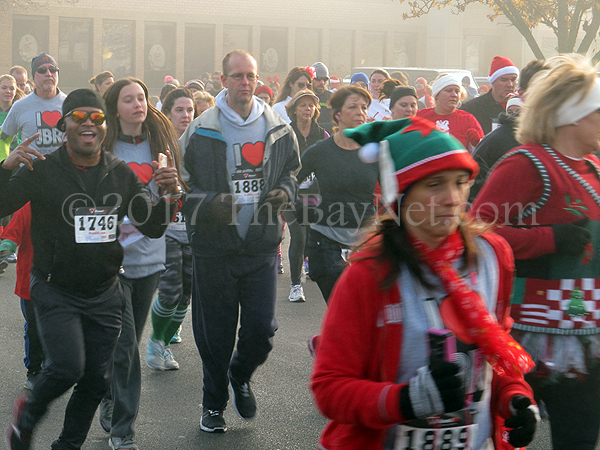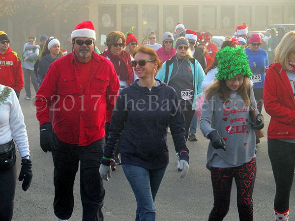 Solomons, MD – Solomons’ 19th annual Jingle Bell Run for the Arthritis Foundation was shrouded in an early-morning, early-December fog that a horde of mad-dashers—many wearing Yuletide costumes—cut through like a Holiday party angel food cake. While there was plenty of fog, there was nothing hazy about who was the fastest man in the 5 kilometer (K) race. William Allen, 26 of St. Leonard—fresh off his razor-thin win at the Thanksgiving Day Turkey Trot in Prince Frederick—bolted to a first-place finish with a time of 16 minutes and 19 seconds. The battle for second-place was much closer, as a pair of 16-year-old speedsters—Kevin McDanal of Mechanicsville and Jack O’Brien, finished second and third respectively. McDanal’s chip time was 19 minutes and 36 seconds, while O’Brien logged a time of 19 minutes and 38 seconds. The race’s top female finisher was Parker O’Brien, 13, with a time of 20 minutes and 20 seconds.